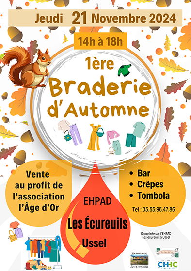 L’équipe d’animation et d’encadrement de l’EHPAD Les Écureuils vous invite à sa 1ère braderie d’automne, qui se tiendra à l’EHPAD les écureuils.