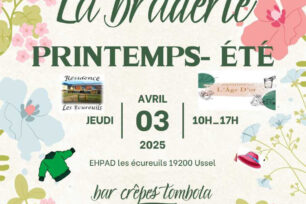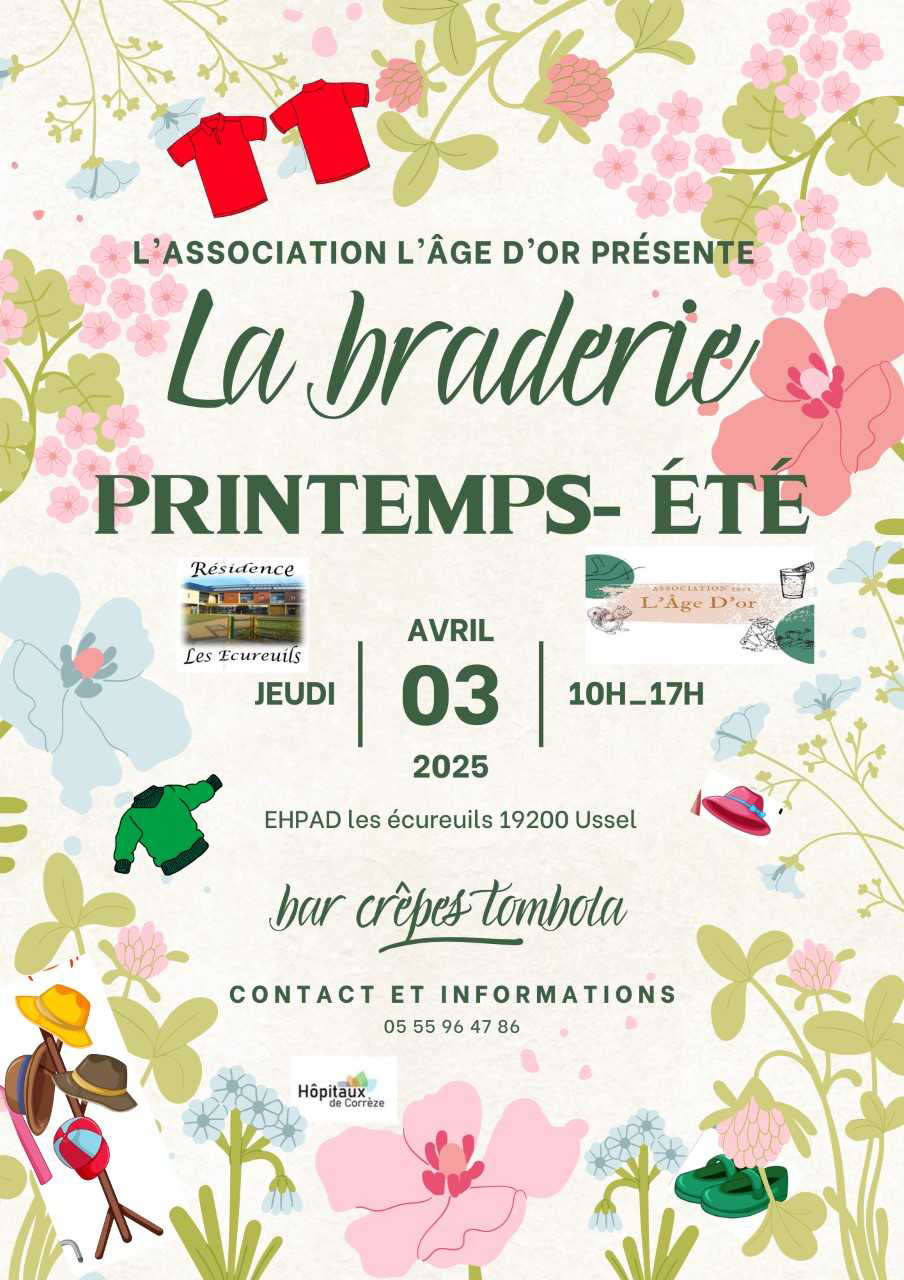 L’Association L’Âge d’Or a le plaisir de vous inviter à sa grande braderie spéciale Printemps-Été le jeudi 3 avril 2025, de 10h à 17h, à l’EHPAD Les Écureuils à Ussel.